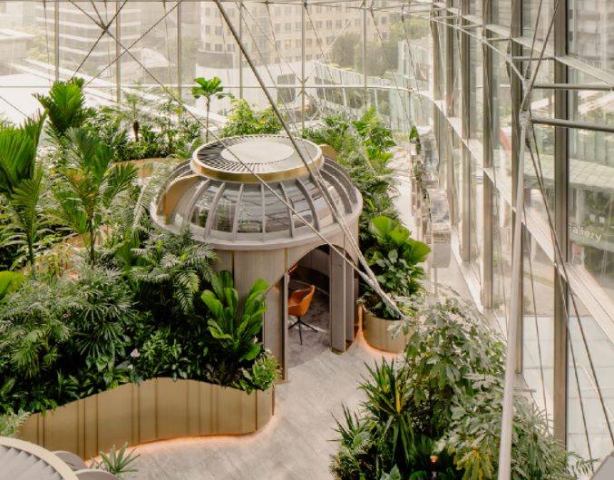 新加坡花旗銀行(Citibank)針對其全球最大的財富咨詢中心的設(shè)計,舉辦了一項國際邀請賽,事務(wù)所 Ministry of Design 拔得頭籌,以「biophilic design」為概念,創(chuàng)造了一間郁郁蔥蔥的“銀行溫室”。
